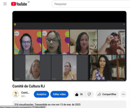 O Comitê de Cultura RJ realizou, no dia 13 de março de 2025, um evento online com o objetivo de criar uma rede de articulação entre mulheres que lideram organizações, coletivos e institutos voltados para o público feminino em municípios do Rio de Janeiro. A ação, realizada em celebração ao Mês da Mulher, foi organizada em parceria com a OSC Celebrante e as OSCs executantes: Instituto Usina Social (RJ), Instituto Caminho da Roça (Petrópolis) e Nação Mestiça (Valença).