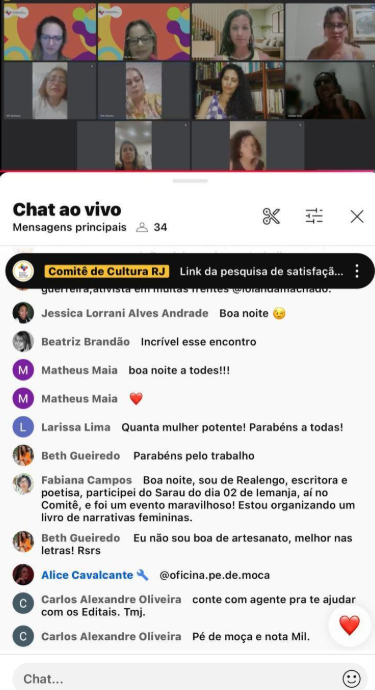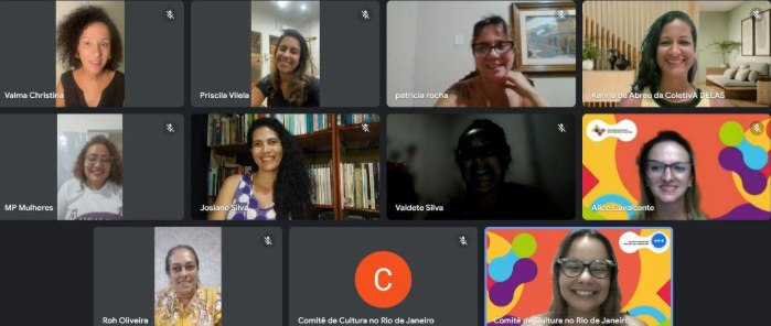 O Comitê de Cultura RJ realizou, no dia 13 de março de 2025, um evento online com o objetivo de criar uma rede de articulação entre mulheres que lideram organizações, coletivos e institutos voltados para o público feminino em municípios do Rio de Janeiro. A ação, realizada em celebração ao Mês da Mulher, foi organizada em parceria com a OSC Celebrante e as OSCs executantes: Instituto Usina Social (RJ), Instituto Caminho da Roça (Petrópolis) e Nação Mestiça (Valença).